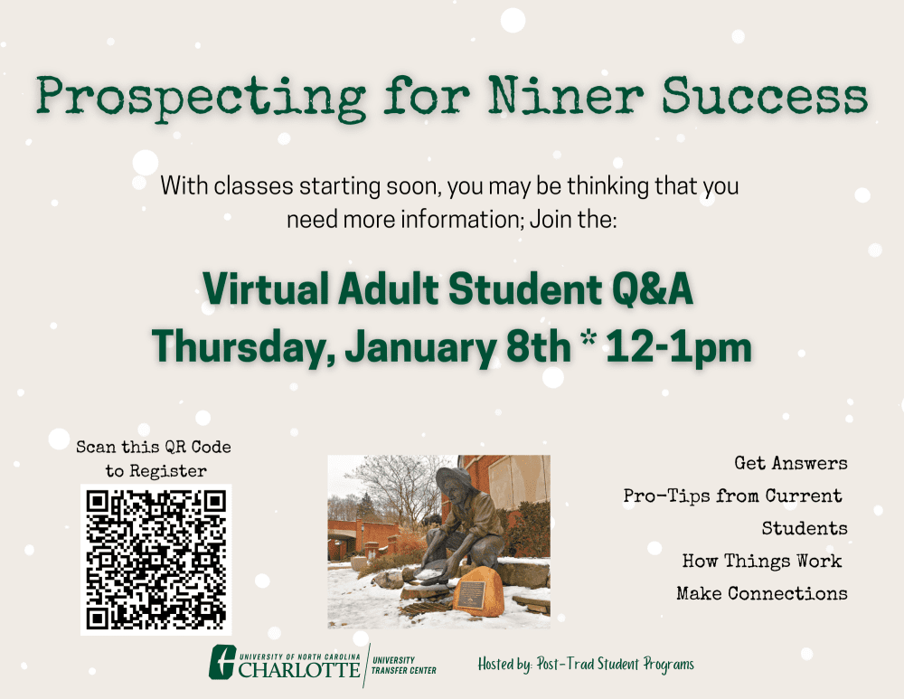 Post-traditional students are a valued part of the UNC Charlotte community. The University Transfer Center is here to help you feel connected, supported, and informed. Whether you’re returning to college after time away, balancing work and family, or transferring in with prior credits, we’re here to support you every step of the way.